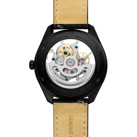 A self-winding mechanical watch with custom see-through skeleton dial and hands. Individually numbered to 500 pieces.