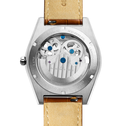 A modern, solid steel case protects the mechanical heart of this dual time zone machine. Individually numbered to 500 pieces.