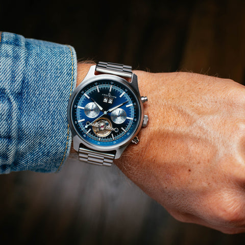 The Blackhawk Automatic gives a nod to vintage aviator watches and features our big date and calendar complication. The open-heart dial allows you to see the balance wheel in motion as you wear it. Our watch cases are made from 316L stainless steel with a scratch-resistant crystal and a stainless steel bracelet, and the strap changes are simple and easy with our quick release springbar system.