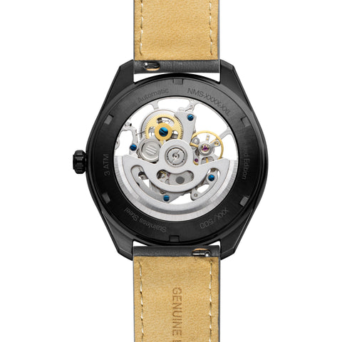 A self-winding mechanical watch with custom see-through skeleton dial and hands. Individually numbered to 500 pieces.