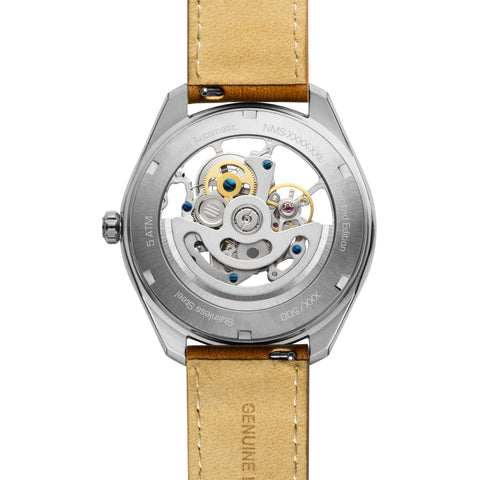A self-winding mechanical watch with custom see-through skeleton dial and hands. Individually numbered to 500 pieces.
